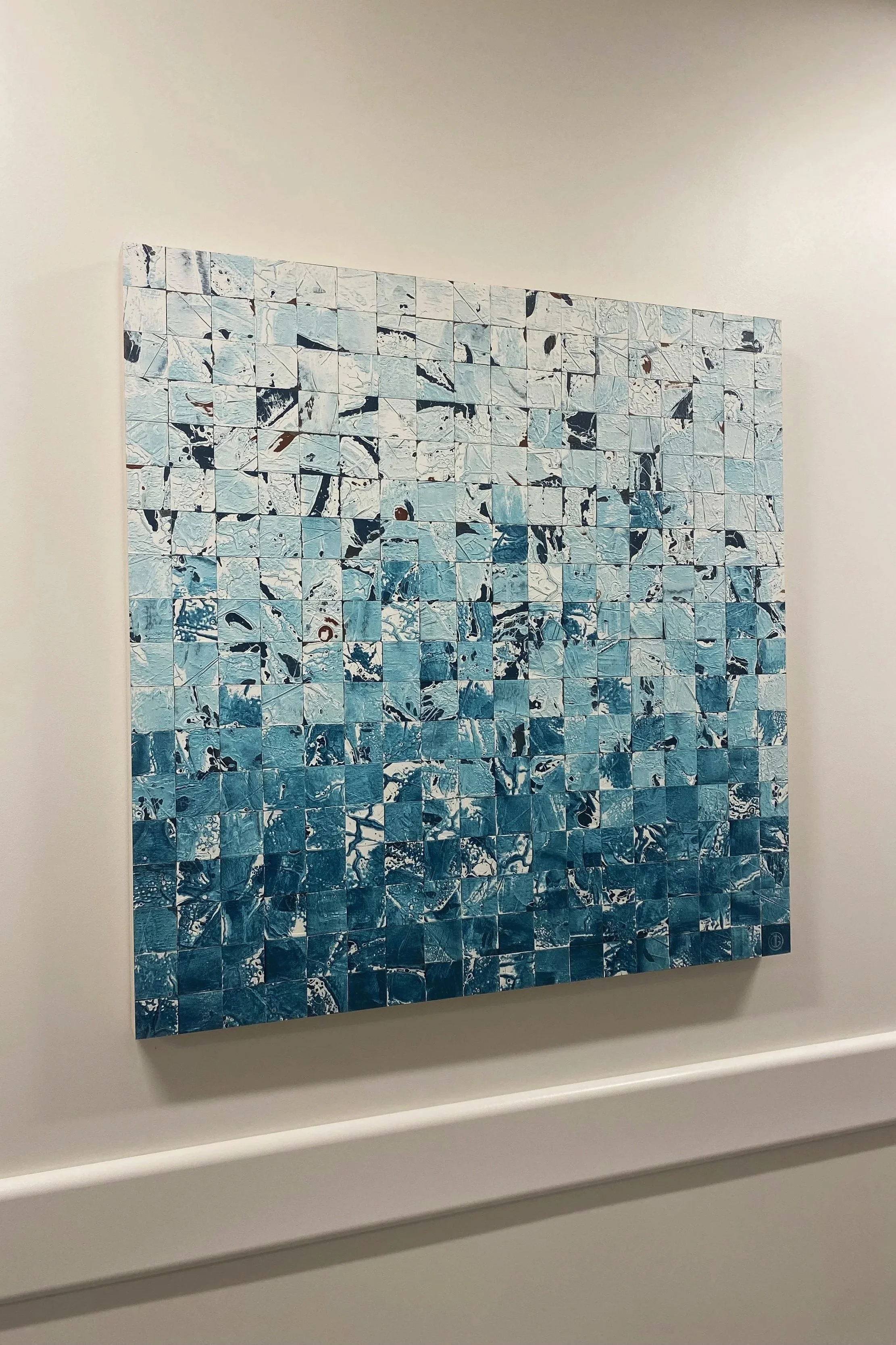 Artwork harmonized with building’s materials (wood, glass, natural light) and water-inspired design motifs already integrated throughout the building.